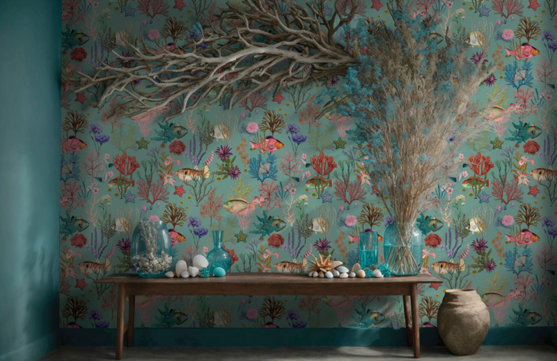 | Art.nr. | 99430 Arboretum/Dutch wallcoverings/Cora Soft Aqua/Vissen |